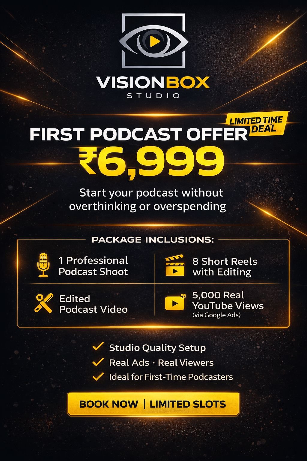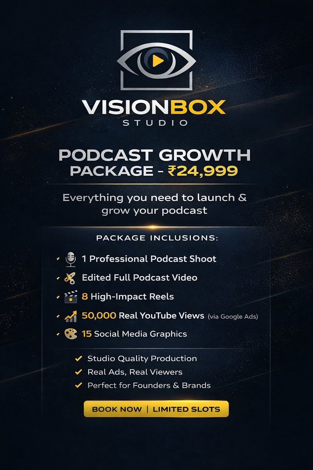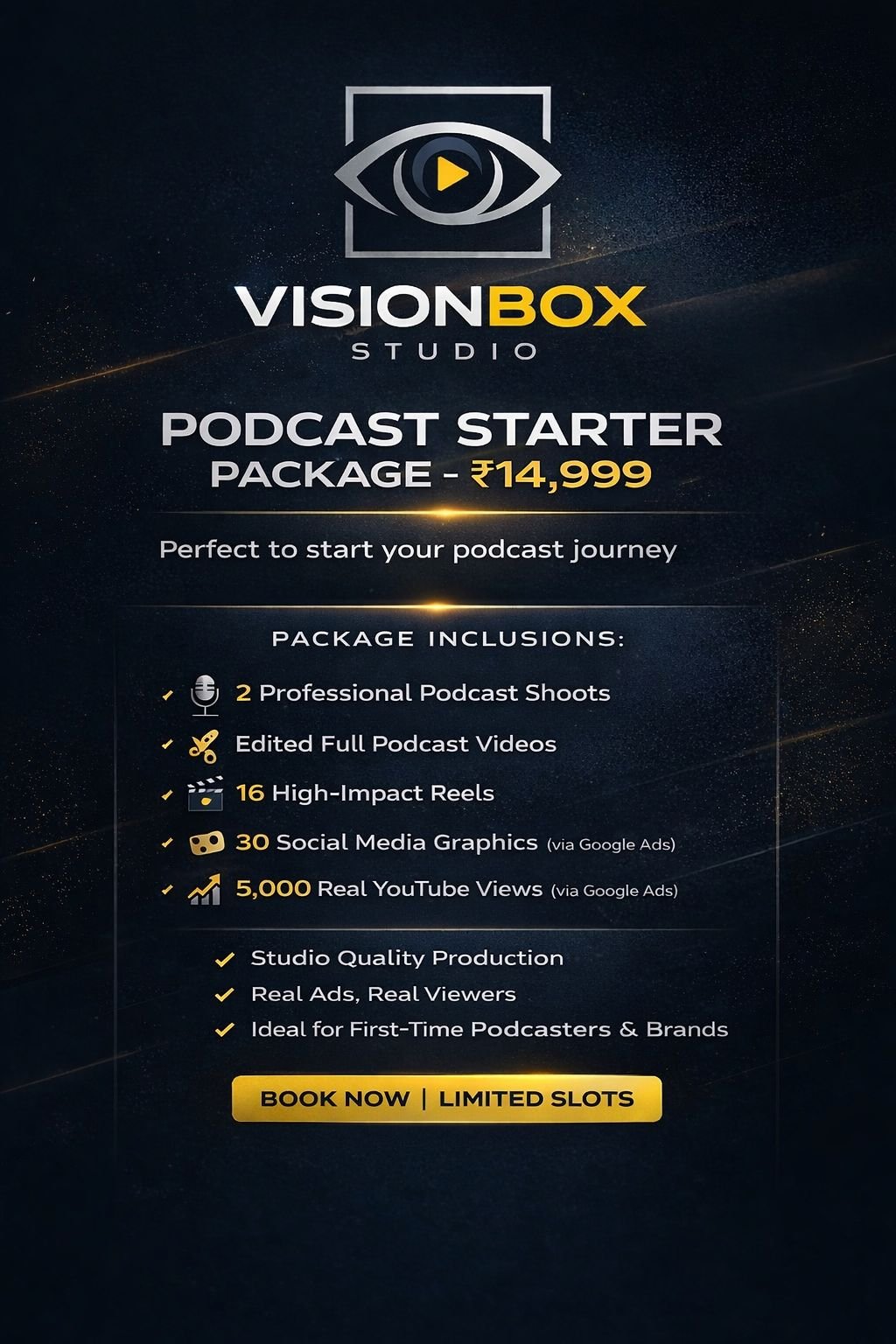 VisionBox Studio is a full-service content production studio specializing in paid podcasts, product shoots, promotional videos, ad films, and short films.